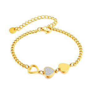 Illuminate your style with the Stellar Heart Trio Braceletāa captivating piece designed for young souls seeking glamour and luxury. Crafted in exquisite 14k Gold, this bracelet features three medium-sized heart charms that symbolize elegance and celestial beauty. Each charm is unique: one is open in the middle, one is filled with solid gold, and the centerpiece dazzles with diamond-like zirconia stones, creating a shimmering constellation on your wrist.
