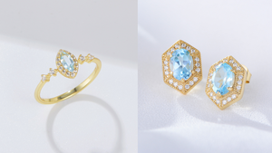 - Gemstones: Sky-blue aquamarine with zircon accents